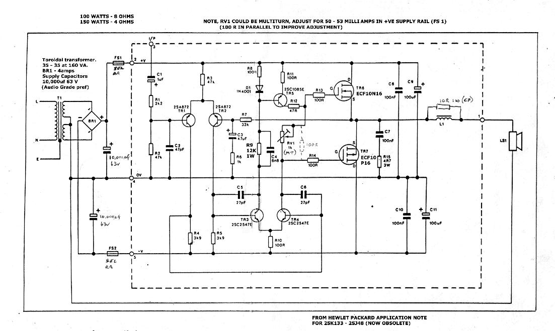 The circuit below is rated at 100 watts into 8 ohms and 150 watts into 4 ohms. If the output mosfets are changed for